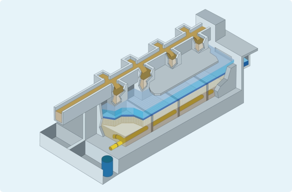 独自のノウハウにより開発した横流移床式砂ろ過装置です。従来の移床式ろ過装置以上の安定した処理性能を持ち、大容量ろ過を実現します。